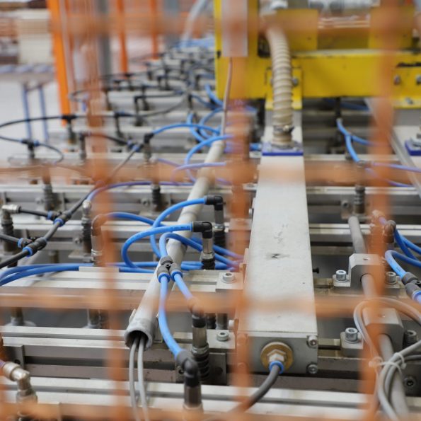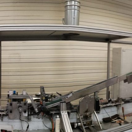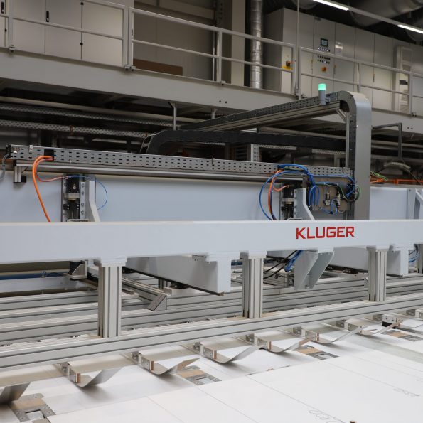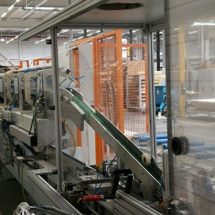 Anlage zum Schneiden und Verleimen von Dämmstreifen.